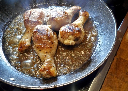 Die Hühnerkeulen (oder -flügerl) salzen, pfeffern und mehlieren. In einer Pfanne beidseitig anbraten, mit ein wenig Wasser ablöschen und zugedeckt dünsten lassen.