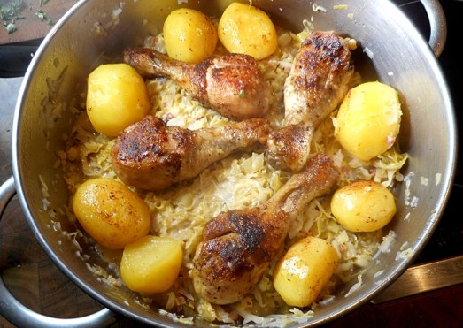 Zutaten: ein Kopf Frühkraut, eine Zucchini, Zwiebeln, Speck (nach Belieben), Öl, Obers, Kümmel, Lorbeerblatt, Weißwein, Salz, Pfeffer, Spritzer Essig, ein wenig Wasser, Hühnerkeulen (oder -flügerl)