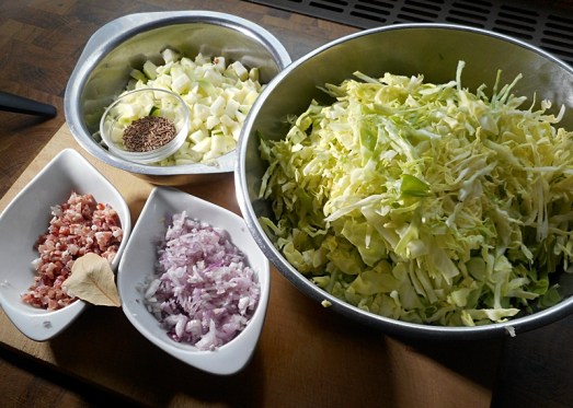 Zwiebel und Speck in etwas Öl glasig anrösten, dann mit Wein und ein wenig Wasser ablöschen. Das Kraut dazugeben und würzen – mit Kümmel, Salz, Pfeffer, einem Lorbeerblatt und einem Spritzer Essig.