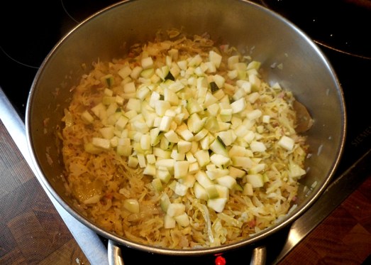 Die würfelig geschnittenen Zucchini zum Kraut geben, durchmischen und alles noch einmal gut durchziehen lassen.