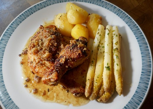 Zutaten: Hühnerkeulen, Speck, Butter, Senf, Öl, Brösel, Mehl, Salz, Pfeffer, Kräuter (Petersilie, Estragon, Majoran, Schnittlauch, Dill, Thymian, Rosmarin), Knoblauch, Spargel für die Beilage