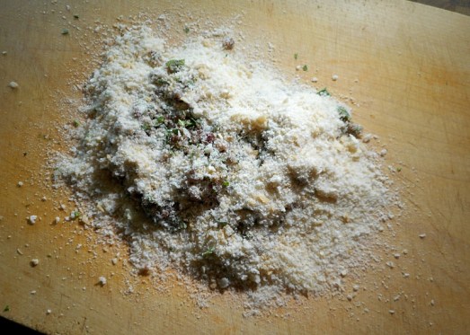 Für die Kräuterkruste werden die Kräuter fein gehackt, der Speck kleinwürfelig und der Knoblauch ebenfalls fein geschnitten – alles zusammen mit den Bröseln gut vermischen. Danach die Butterstückchen unterarbeiten.