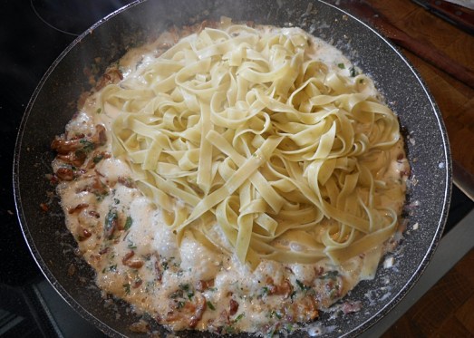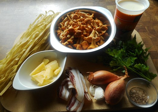 Zutaten: Eierschwammerl, Speck (oder auch nicht), Zwiebel, Knoblauch, Butterschmalz, Obers, Kümmel, Salz, Pfeffer, Petersilie, Nudeln