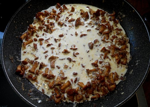 Jetzt die geputzten und gewaschenen Eierschwammerl dazu geben, und …