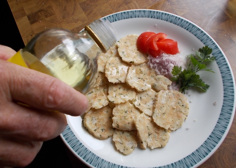 Und so schnell geht’s: Den Knödel in sehr dünne Scheiben schneiden, auf einem Teller auflegen, gehackten Zwiebel, Petersilie und Tomaten dazugeben, mit Essig und Öl verfeinern.