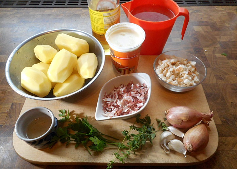 Zutaten: Kartoffeln, Zwiebeln, Knoblauch, Öl, Obers, Suppe (Fond oder Würfel), Majoran, Lorbeerblatt, Essig, Salz, Pfeffer, Petersilie, Brotwürfel für Croutons und eventuell Speck für geröstete Speckwürfel