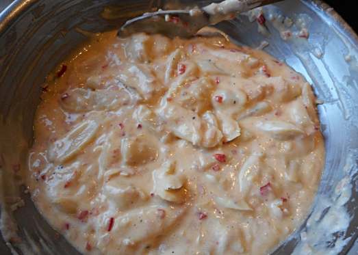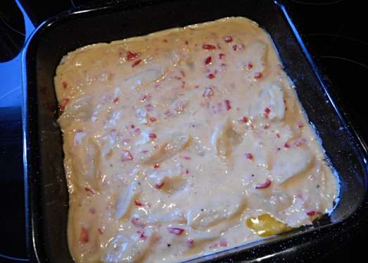 Für die Sauce Béchamel die Eier trennen und das Eiweiß zu Schnee schlagen. Die Butter leicht erhitzen. Mehl einrühren, leicht anschwitzen lassen (darf nicht braun werden), mit Milch kalt aufgießen und unter ständigem Rühren erhitzen. Auskühlen lassen. Die Ei-Dotter, den klein geschnittenen Schinken, Paprikawürfel und Käse dazugeben. Mit den Schwarzwurzeln gut durchmischen, würzen, den Eischnee darunter heben und die Masse in eine gut gefettete Auflaufform geben.