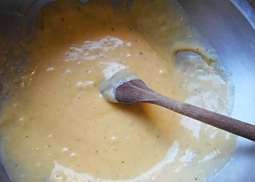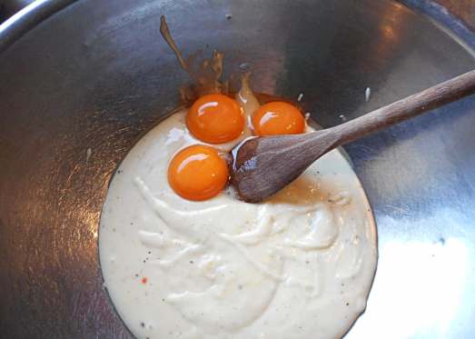 Für die Sauce Béchamel die Eier trennen und das Eiweiß zu Schnee schlagen. Die Butter leicht erhitzen. Mehl einrühren, leicht anschwitzen lassen (darf nicht braun werden).