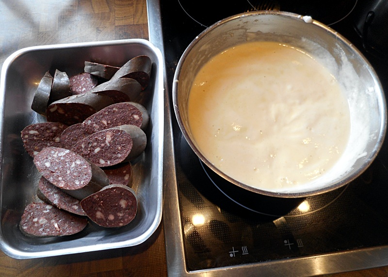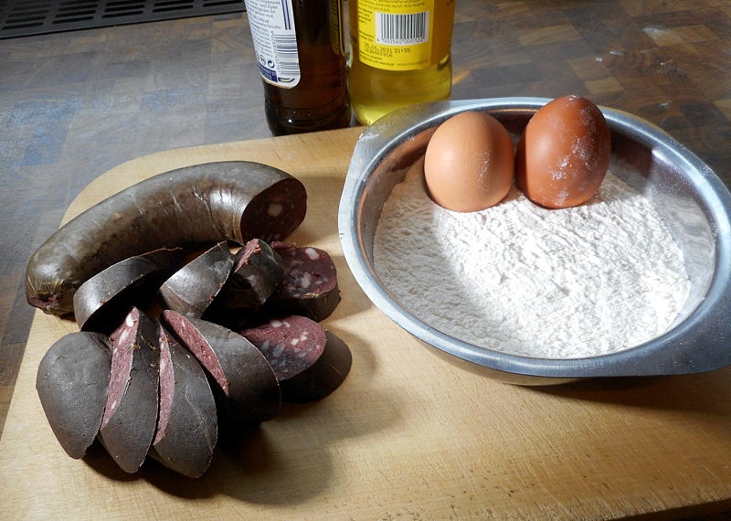 Zutaten: Blutwurst, Butterschmalz oder Öl. Für den Backteig 200 g Mehl, 2 Eier, 1 EL Öl, 1/4 l Bier, Salz