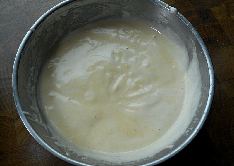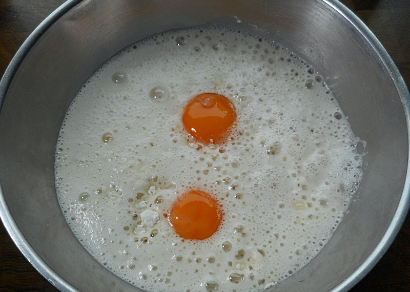Die Eier trennen. Mehl mit den Eidottern, Öl, Salz und Bier zu einem dickflüssigen Teig anrühren. (Das Bier macht den Teig lockerer.)