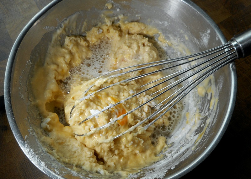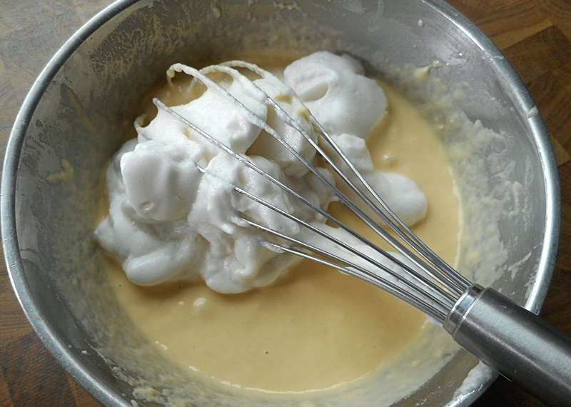 Aus den Eiklar einen steifen Schnee schlagen und in den Teig einrühren, der dann eine halbe Stunde rasten soll.