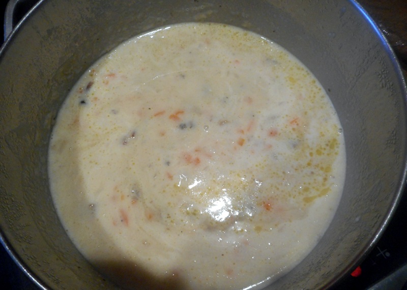 Zutaten: Geflügelfleisch (zB gekochte oder gebratene Hendl-Reste), Rindssuppe (Würfel oder Fond), 1 kleine Zwiebel, Wurzelgemüse (Karotten, Sellerie, Petersilienwurzel), 100 g Butter, 60 g Mehl, 1/8 l Obers, 1 Dotter, Salz, Pfeffer, Muskat.