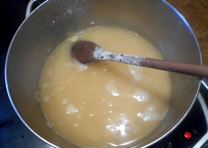 Eine Einbrenn zubereiten. Dazu die fein geschnittene Zwiebel in der Butter glasig anschwitzen. Dann das Mehl dazugeben, durchrühren und kurz anrösten lassen. Mit der Suppe aufkochen und etwas köcheln lassen.