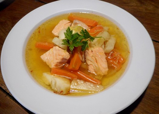 Zutaten Fischsuppe: 400 g Fisch (Lachs, Kabeljau), eine Zwiebel, 300 g Wurzelgemüse (Karotten, Sellerie, Lauch), 1,5 Liter Fischsud (oder normale Suppe), Öl, Safran, Salz, Pfeffer, Weißwein