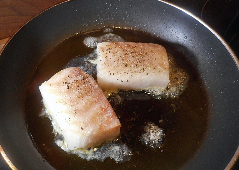 Den Fisch salzen, pfeffern, mit Zitronensaft beträufeln und einer Seite leicht bemehlen. Auf beiden Seiten anbraten.