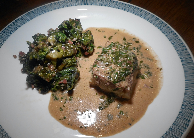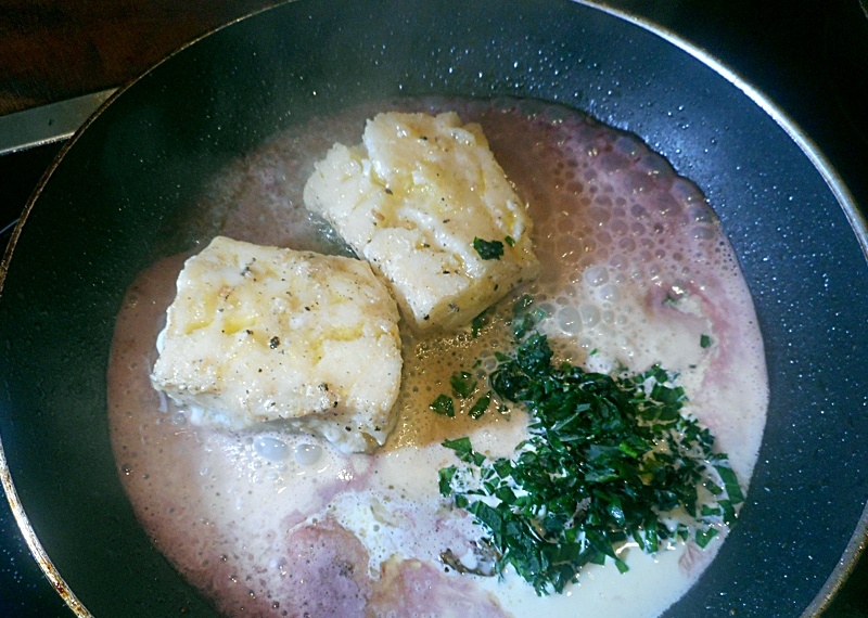 Mit ein wenig Weißwein ablöschen und zugedeckt einige Minuten dünsten lassen. Etwas Obers und ein kleines Stück Butter und gehackte Petersilie dazugeben und durchrühren.