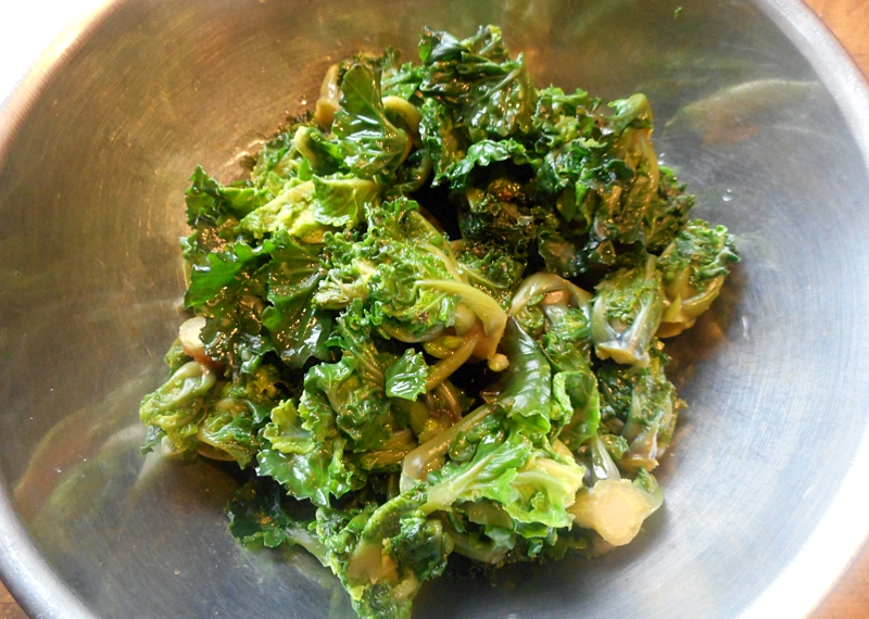 Die blanchierten Kalettes untermischen, würzen und noch kurz rösten lassen.