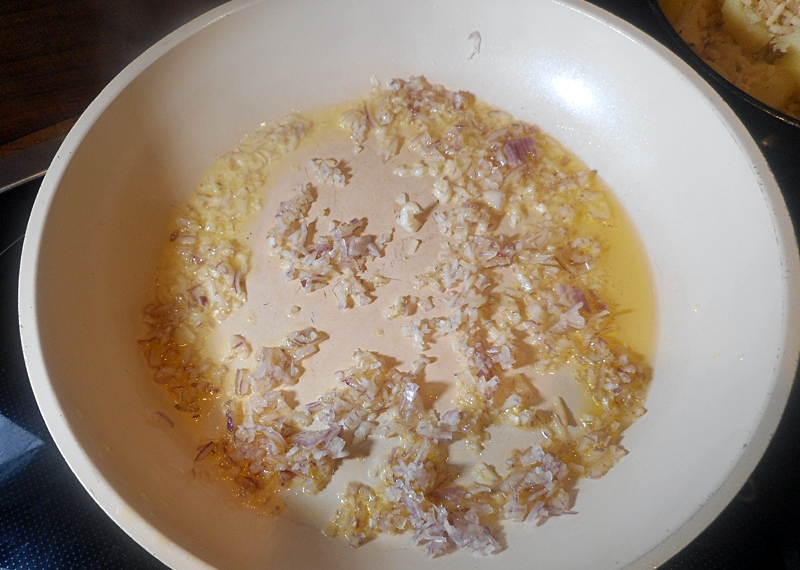 Zwiebel fein schneiden und Speck klein-würfelig. Anschließend Zwiebeln und Speck glasig anrösten.