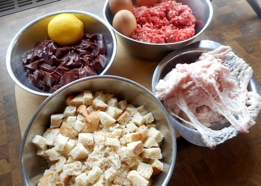 Zutaten: 400 g Schweinsleber, 600 g gemischtes Faschiertes, 3 Semmeln, 4 Eier, 1/4 l Milch, 1 Zwiebel, 3 Zehen Knoblauch, Majoran, Muskat, Kümmel, Thymian, Zitronenschale (Abrieb), Salz, Pfeffer, Petersilie, Schweinsnetz
