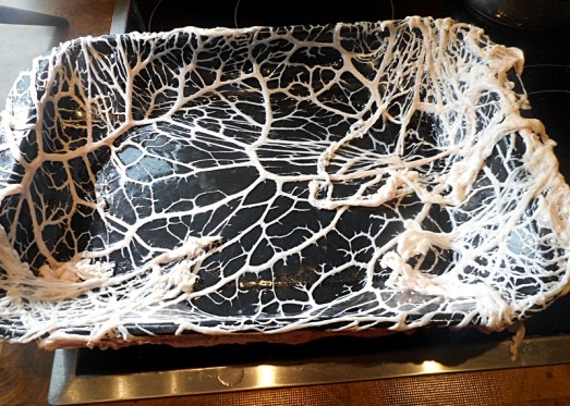 Das Schweinsnetz aus dem Wasser nehmen (ein wenig ausdrücken) und mit ihm eine ofenfeste Form auslegen.