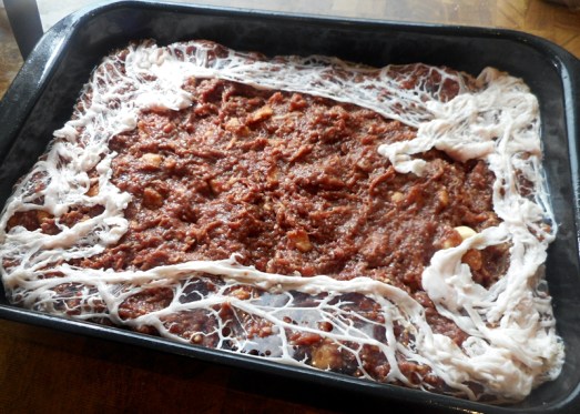 Das Schweinsnetz aus dem Wasser nehmen (ein wenig ausdrücken) und mit ihm eine ofenfeste Form auslegen. Die Masse einfüllen und mit dem Rest des Netzes bedecken.
