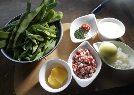 Zutaten: 1 kg Bohnen, 1 Zwiebel, 1 Esslöffel Dill, 100 g Speck, 100 g Butter, 1/8 l Obers, Muskat, Pfeffer, Salz