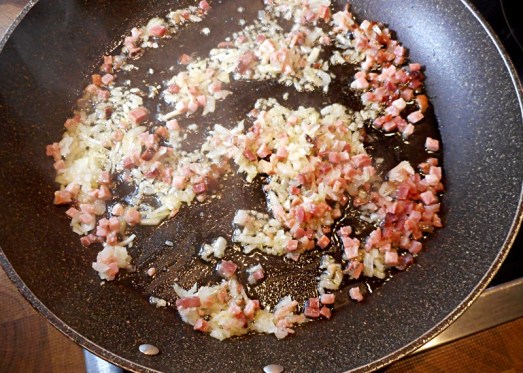 Zwiebel fein schneiden und mit Butter und Speck glasig anschwitzen.