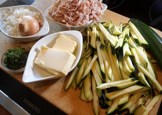 Zutaten Schinken-Zucchini: 2 Zucchini, 150 g Schinken, 100 g Butter, 1 kleine Zwiebel, Salz, Pfeffer