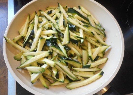 Die Zucchini in dünne Streifen und die Zwiebel fein schneiden. Die Zwiebel mit …