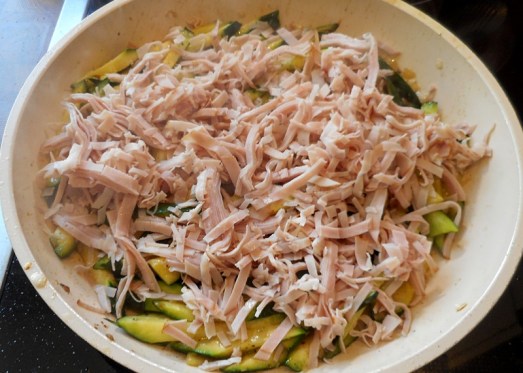 Die Zucchini in dünne Streifen und die Zwiebel fein schneiden. Die Zwiebel mit den Zucchini in Butter anrösten und würzen. Den Schinken darüber streuen, gut durchmischen, kurz mitrösten lassen, fertig.