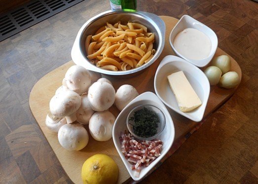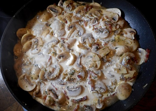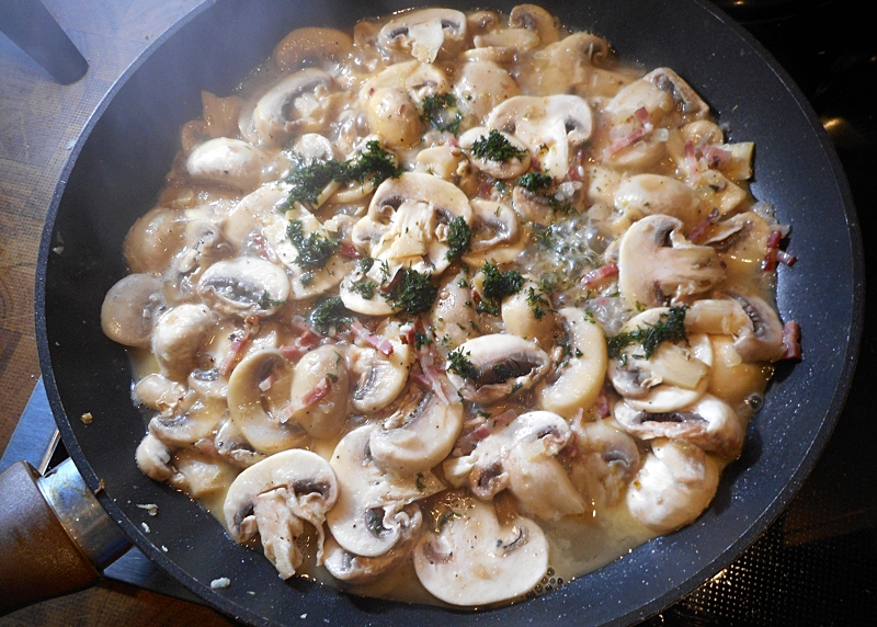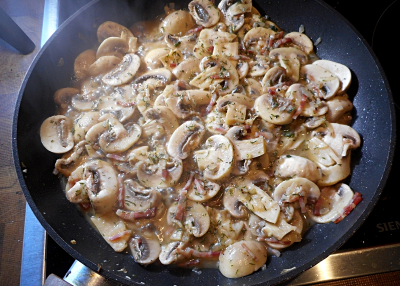 Zutaten: Champignons, Zwiebeln, Butter, Obers, Dill, Zitronensaft, Weißwein, Salz, Pfeffer und, falls gewünscht, Speck