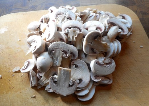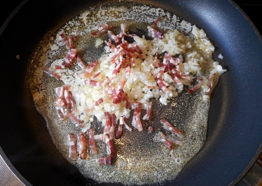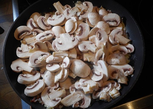 Zwiebel fein und Champignons in dünne Scheiben schneiden. (Speck würfeln.)