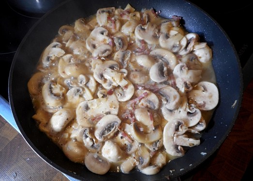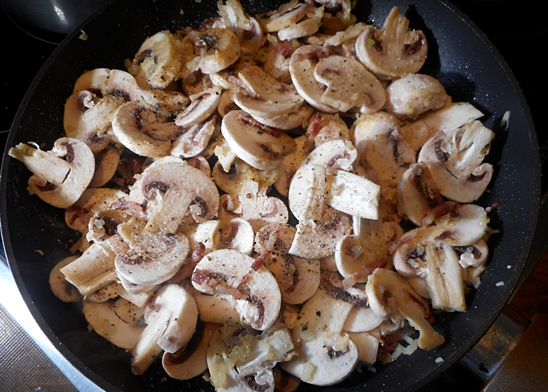 Zwiebel (und Speck) anrösten. Champignons dazugeben und weiter rösten. Mit Salz und Pfeffer würzen und mit Zitronensaft und Wein ablöschen.