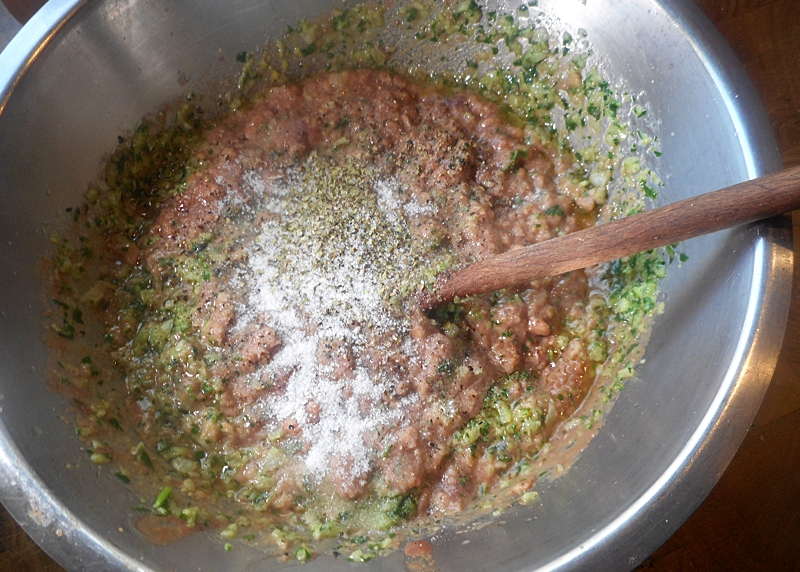 Zwiebel, Knoblauchzehe und Petersilie fein hacken, vermischen und in heißer Butter leicht anlaufen (ganz kurz rösten) lassen. Danach in die Leber-Semmel-Masse einrühren. Mit Salz, Pfeffer und Majoran würzen. Ein Ei, Semmelbrösel und Mehl untermischen.