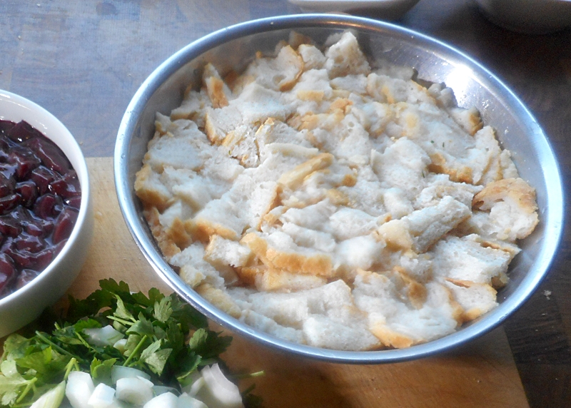 Die Semmeln in kleine Würfel schneiden und in Wasser einweichen.