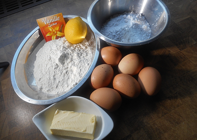 Zutaten Biskuit: 6 Eier, 180 g Zucker, 150 g Mehl, ca. 20 g Butter, Vanille, Prise Salz, Zitronenabrieb, etwas Rum
