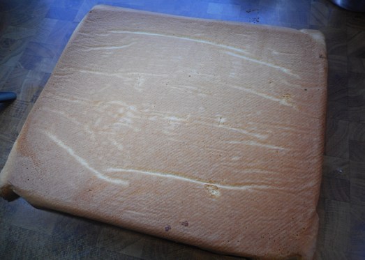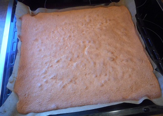Die Masse auf ein mit Backpapier ausgelegtes Backblech streichen und im auf 180 Grad vorgeheizten Rohr 25 Minuten backen. Stürzen, das Papier abziehen und auskühlen lassen.