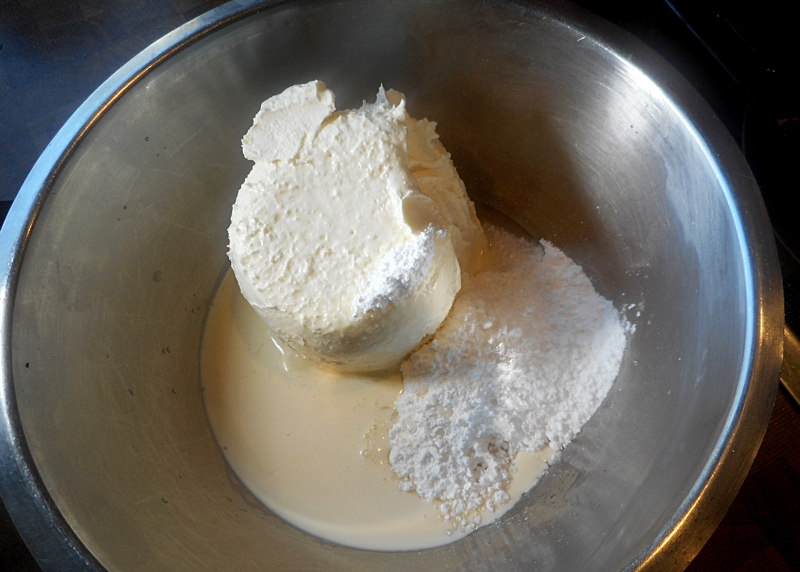 Für die Creme die Mascarpone mit Zucker, Obers, Zitronensaft und Amaretto cremig rühren.