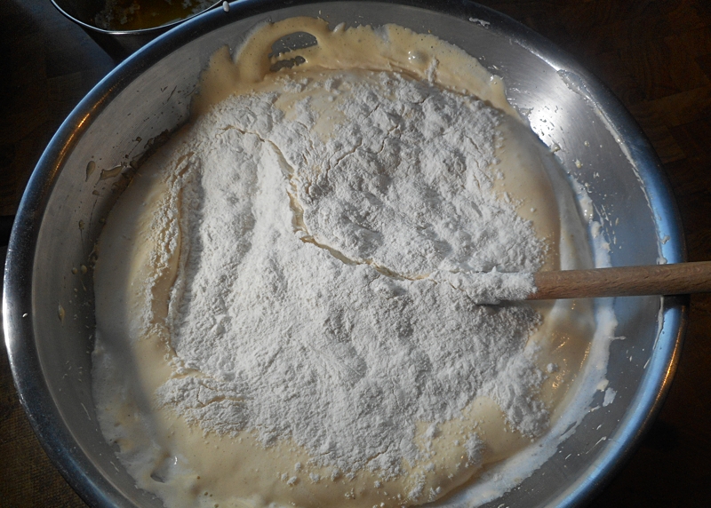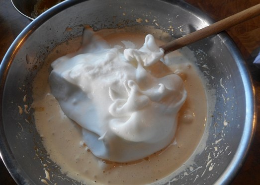 Erst den Eischnee, dann das Mehl unterheben. Zum Schluss wird noch die zerlassene Butter dazu gemischt.