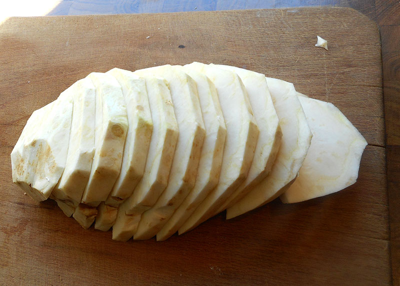 Zutaten: ein schöner Sellerie, Bier, drei Eier, drei bis vier gehäufte Esslöffel Mehl, Muskat, Salz, Pfeffer
