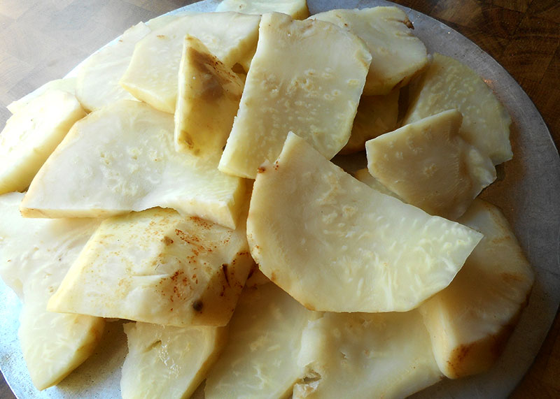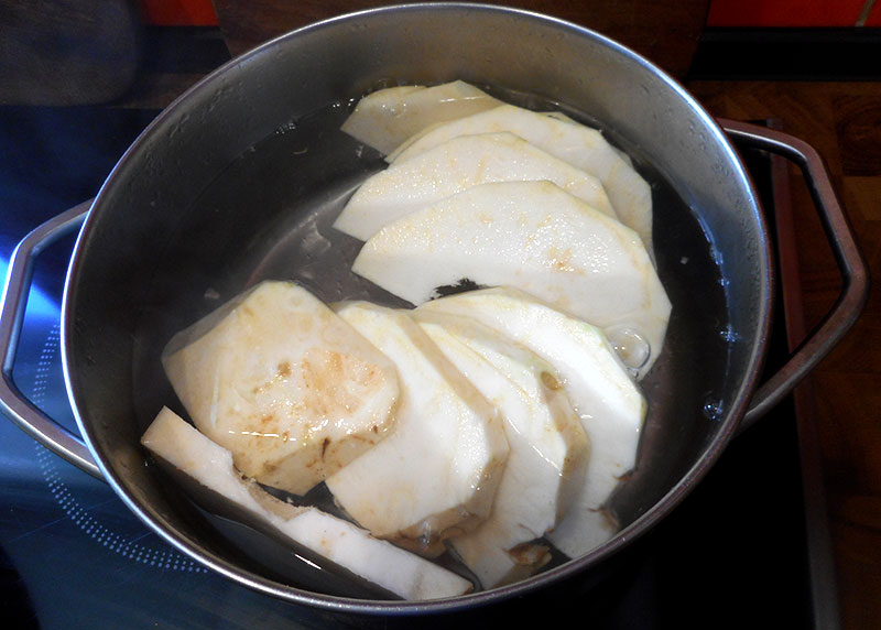 In kochendem Salzwasser etwas blanchieren – nur zwei bis drei Minuten, so wird er weicher, ist schneller herausgebacken und braucht somit weniger Fett. Abtropfen lassen.