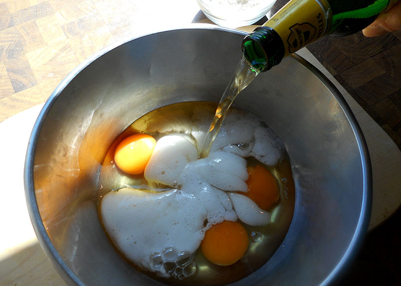 Den Bierteig vorbereiten: In eine Schüssel Bier geben, Eier dazu schlagen und mit dem Schneebesen sehr gut verrühren.