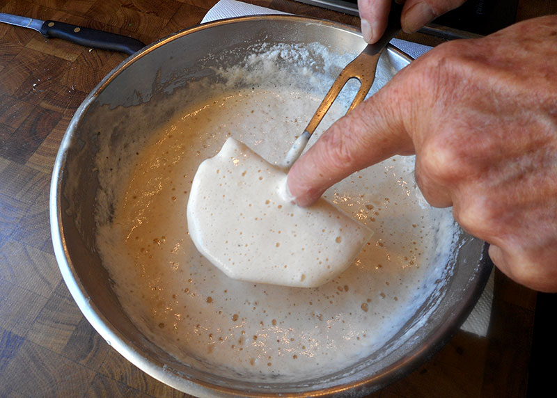 Den Bierteig vorbereiten: In eine Schüssel Bier geben, Eier dazu schlagen und mit dem Schneebesen sehr gut verrühren. Jetzt nach und nach Mehl beigeben – nicht alles auf einmal, sondern dazwischen verrühren und probieren, ob der Teig schon eine schöne Konsistenz hat. Dann mit Muskat, Salz und Pfeffer abschmecken.
