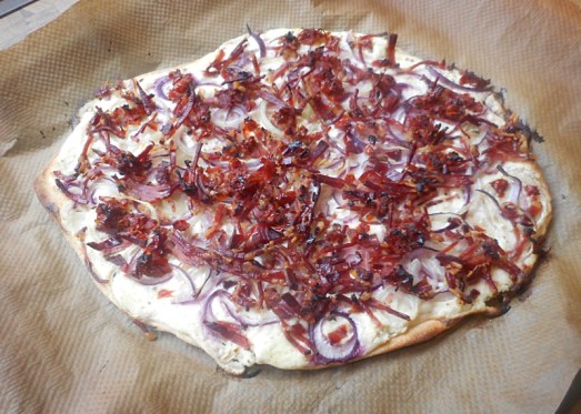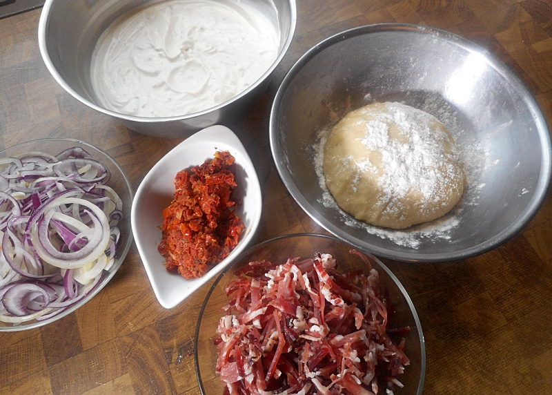Zutaten Belag: 150 g Speck, 2 Zwiebel, getrocknete Tomaten, ein Becher Sauerrahm, ein Becher Crème fraîche, Salz, Pfeffer, Muskat