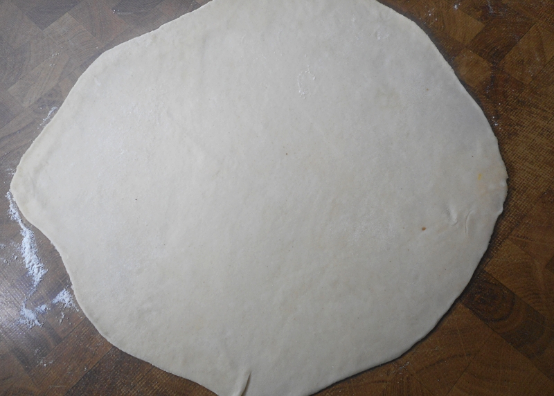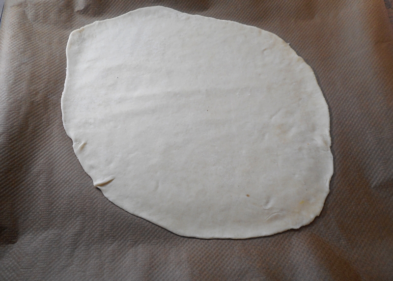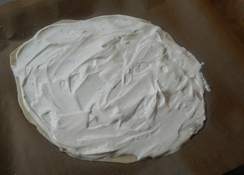 Den Teig halbieren (die Menge ist für zwei Flammkuchen gedacht), dünn ausrollen und auf ein mit Backpapier belegtes Backblech geben.