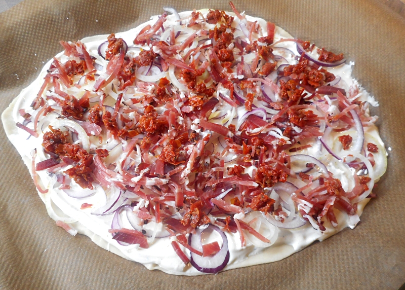Den Teig nun mit der Sauerrahm-Crème fraîche-Mischung bestreichen und mit den Zwiebelringen, dem Speck und den getrockneten Tomaten belegen.