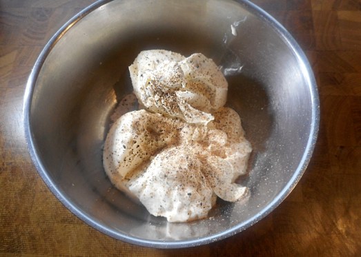 Die Crème fraîche und den Rahm in einer Schüssel glatt rühren und mit Salz, Pfeffer und Muskat würzen.