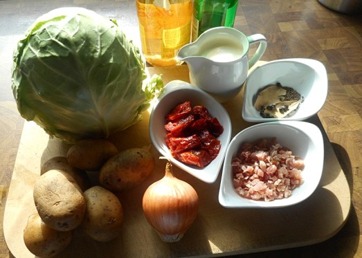 Das Kraut nudelig schneiden, die Zwiebeln und die getrockneten Tomaten fein schneiden und den Speck würfeln. Die Kartoffeln schälen.