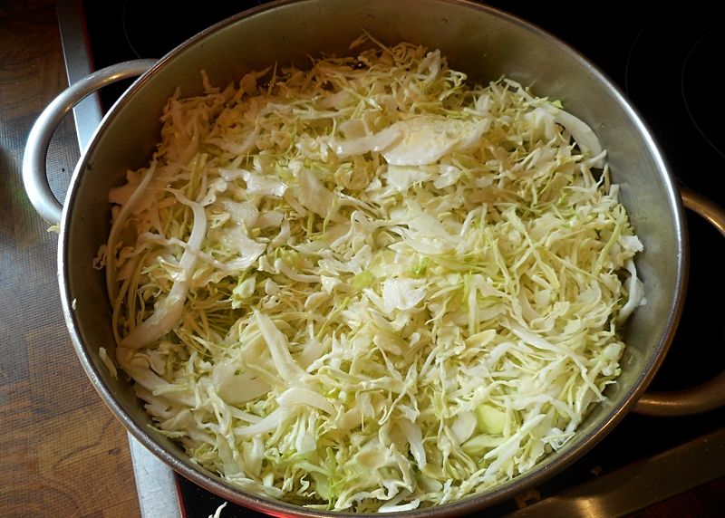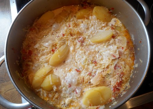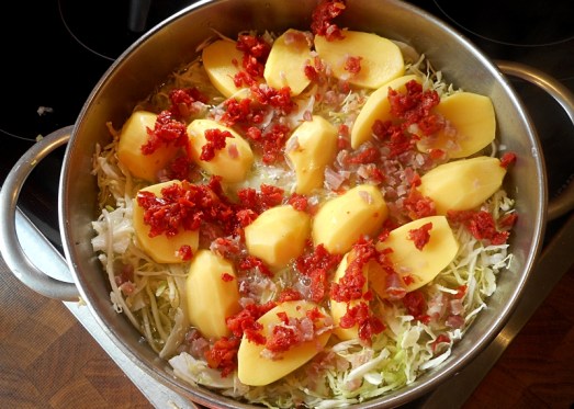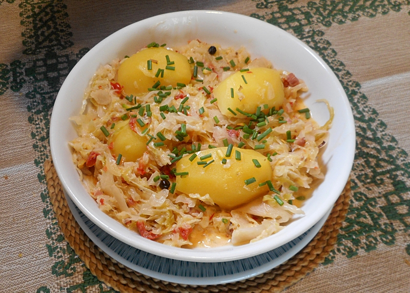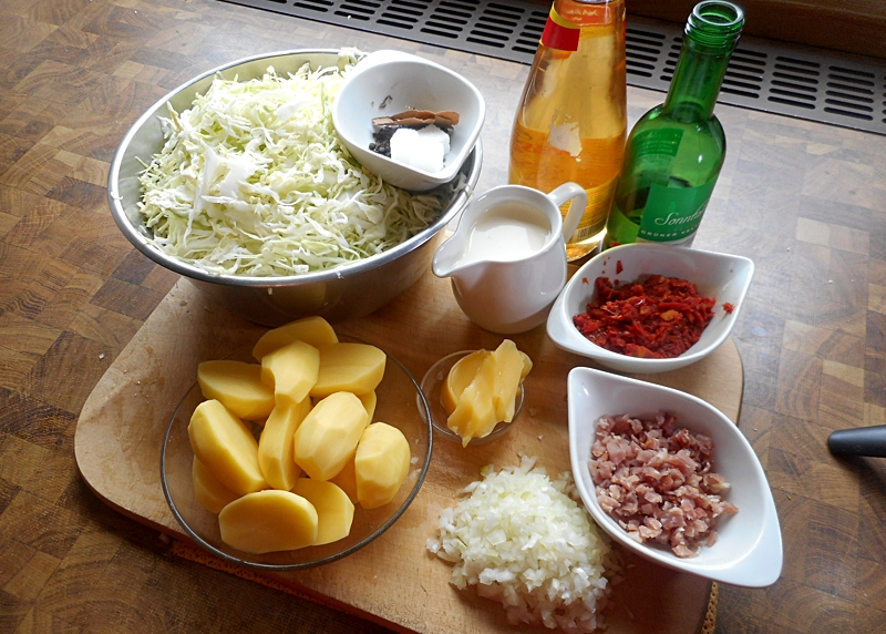 Zutaten: Frischkraut (das erste Kraut des Jahres), Kartoffeln, Zwiebeln, getrocknete Tomaten, Speck, 1 Esslöffel Butterschmalz oder Öl, 1/8 l Obers, 2 Esslöffel Essig, 1/16 l Wein, Salz, Lorbeer, Kümmel, Pfefferkörner, 1 Esslöffel Zucker, Suppe oder Wasser zum Aufgießen