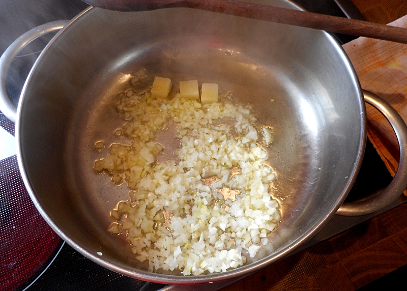 Wenn die Kartoffeln weich sind, Obers einrühren und noch kurz weiter dünsten.